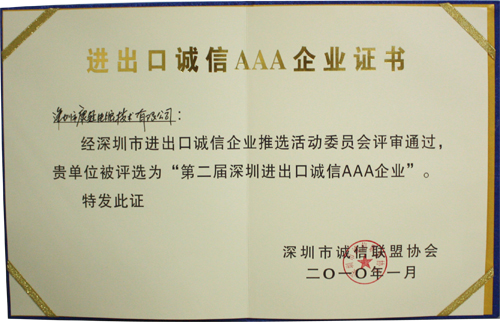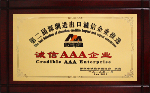 2010年1月,经深圳市进出口诚信企业推选活动委员会评审通过,我司被评选为“第二届深圳进出口诚信AAA企业”。