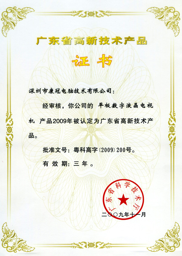 据广东省科技厅消息,我司平板数字液晶电视机被广东省科技厅认定为2009年广东省高新技术产品,标志着我司平板数字液晶电视机技术达到国内先进水平。这也是我司继液晶显示器产品被认定为高新技术产品之后,又一产品获得该认定。