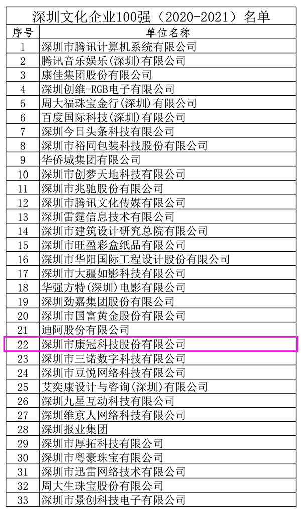 2021年9月,深圳市文化广电旅游体育局发布了“ 深圳文化企业100强 ”企业名单。爱游戏官网公司成功入围本次“深圳文化企业100强”,位列榜单第22位。近期,公司收到了“深圳文化企业100强”牌匾。